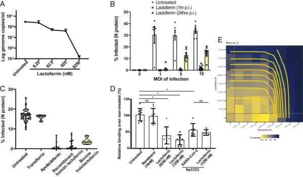 Оказалось, что многофункциональный белок лактоферрин, который содержится в грудном молоке, блокирует SARS-CoV-2 уже на стадии заражения — он не даёт коронавирусу прикрепляться к клеткам. Также он «подстёгивает» клетки давать сильный иммунный ответ коронавирусу за счёт увеличения выработки интерферонов. Наконец, лактоферрин снижает уровень воспаления в клетках.
